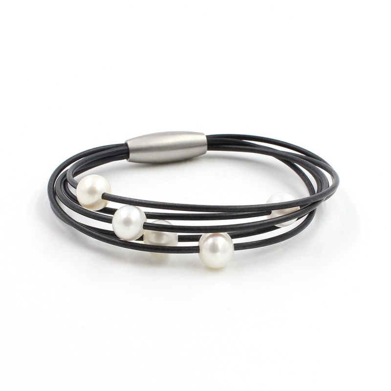 TeNoRubber and white pearl 5-strand rubber bracelet with brushed steelstrong magneticclasp.