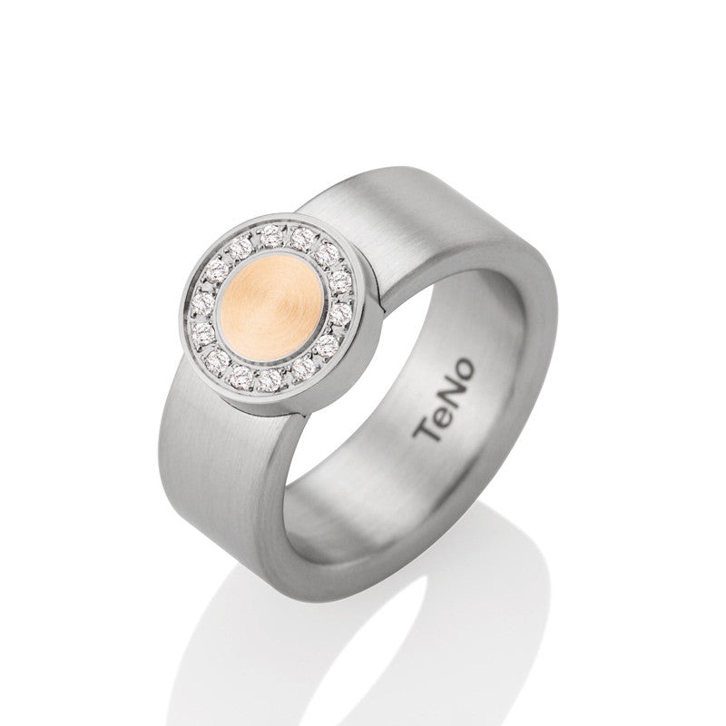 TeNo Stainless Steel DeLuxx Ring with a raised round top set with 18kt. Rose Gold Inlay and 0.112ct. Total Weight Diamonds.