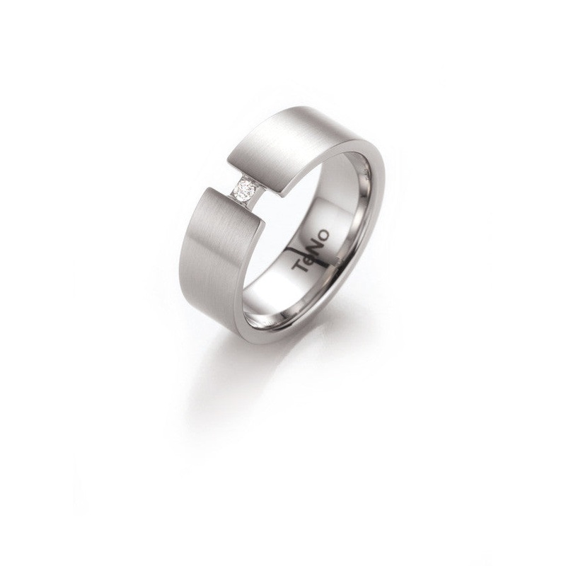 FINAL SALE !TaMor ring, set with 1 diamond on tension bridge, 0.04ct.Ring Width: 7.5mmRing Thickness: 2.3mmTeNo jewelry is made of the finest stainless steel that is free of nickel. In terms of allergic safety and high durability this material is superior