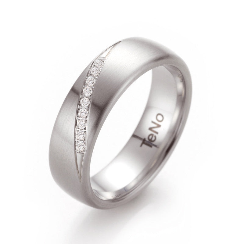 FINAL SALE !Style # 069.25P07.00TeNo Stainless Steel Rounded Ring with a diagonal line of 9 pave set diamonds, 0.072ct. Total Weight.6mm wide2mm thickTeNo jewelry is made of the finest stainless steel that is free of nickel. In terms of allergic safety and