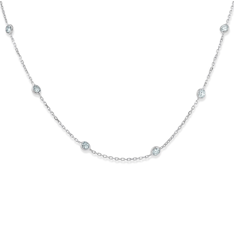 This high quality women's necklace features 12 round brilliant cut natural diamonds All diamonds are bezel set in solid 14k white gold. The necklace is 18"Item #: BDDBY150Width: 1 mmWeight: 3 gMetal: 14k White GoldDiamond Cut: RoundDiamond Color: G-HDiamon