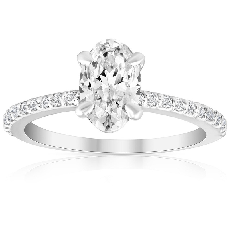 This stunning womens engagement ring features a 1ct oval lab grown diamond and 22 round brilliant cut accent diamonds. All stones are set in solid white gold high polished mounting.