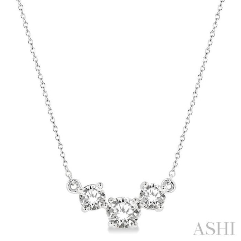 A striking diamond necklace, this makes a fine addition to one's jewelry collection. It is simple yet eye-catching, with its three-stone center that glistens brightly, adding sparkle and glamour to the necklace. A 5/8 Ctw round cut center stone sits in the