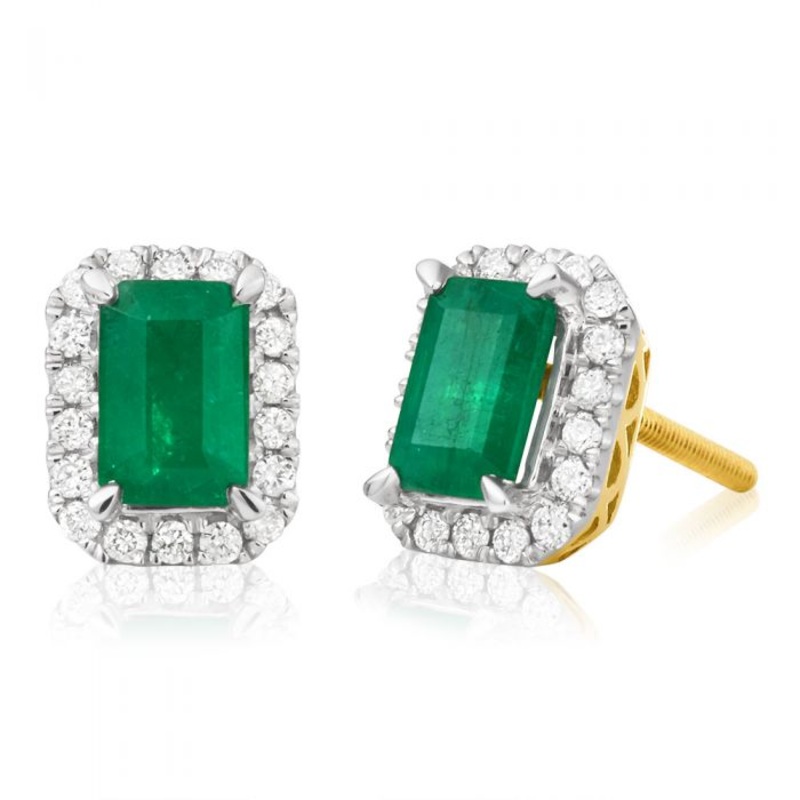 Be a trendsetter in green with these exquisite Gold and Emerald Diamond Stud Earrings. Crafted from luxurious 9ct gold and embellished with 1/5 carat diamond, theyre impressive and a sure conversation starter.
