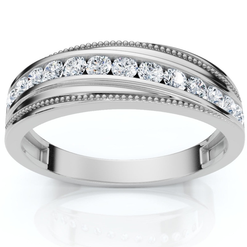 This high quality men's ring features round cut lab grown diamonds. All diamonds are set in solid 10k gold. The diamonds are channel set in polished 10k gold band.Item #: WR9547LGWidth: 6 mmWeight: 4.9 gMetal: Diamond Cut: RoundDiamond Color: F/GDiamond Cl
