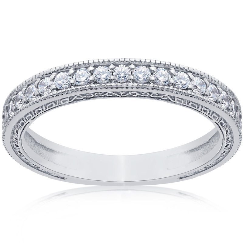 This womens ring features round cut natural diamonds. All diamonds are set in solid 14k white gold. 1/2ct total diamond weight. Wall of ring has unique hand carved scroll details.Item #: WR0101Width: 3 mmWeight: 2.5 gMetal: 14k White GoldDiamond Cut: Round