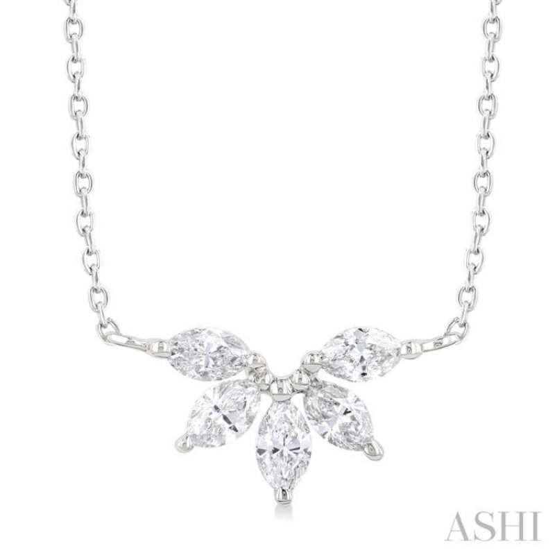 Graceful and radiant, this diamond fashion necklace is a celebration of refined beauty. 5 exquisite prong set marquise cut diamonds are elegantly arranged in a delicate arch, evoking the charm of a blossoming half-flower, in the centerpiece. Held on a sleek 18-inch Cat-25 chain, the necklace is designed in a polished rhodium finish 14 karat white gold, offering a perfect balance of modern elegance and timeless sophistication. Whether worn alone or layered, the diamond fashion necklace is a luminous statement of style. Total diamond weight is 1/3 Ctw.