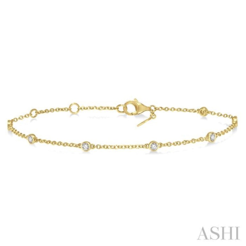 Delicately designed light jewelry, like this lovely diamond station bracelet, is ideal for anytime wear. So, if you do not have enough time to change your accessories, your bracelet will still work for you, no matter what ensembles you choose. Here, the bracelet features 7 circular mounts, which as a station bracelet are connected via cable link chains. The chain links create an equal distance between the mounts. Each mount is embellished with a bezel set round cut diamond, total 7 on the 7 mounts. The diamond station bracelet is secured by a lobster clasp and is framed in 14 karat yellow gold. The total diamond weight is 1/4 Ctw.