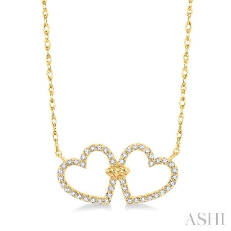 The heart is a symbol of love and has been a popular jewelry charm since the victorian Era. A heart charm can be a single heart, two conjoined hearts, fused hearts, a heart combined with other charms, and other styles. Here is a fused twin-heart necklace, wherein two hearts seal together in the center, via a rope link. The united hearts are decorated with diamonds to add beauty and visual appeal to the necklace. There are 48 prong set round cut diamonds embellishing the twin heart necklace. The necklace is completed by a Rope chain and is styled in a 10 karat yellow gold. The total diamond weight is 1/4 Ctw.