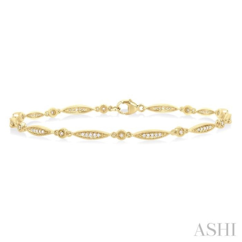 A dainty diamond fashion bracelet, this offers a delicate look to the wrist. It features a link of 10 sleek, hollow, elongated marquise shape mounts, connected via 10 small round mounts between them. Both marquise and round mounts are decorated with round cut diamonds. While a pave set round cut diamond each, total 10, adorns the round mounts, 5 each, total 10, pave set round cut diamonds embellish the marquise mounts. A milgrain border is seen on all the mounts. An easy to wear lobster clasp closure secures the bracelet. The diamond fashion bracelet is styled in 10 karat yellow gold. The total diamond weight is 1/4 Ctw.