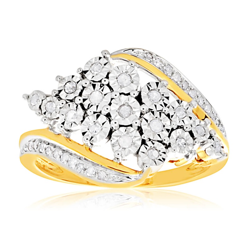 Make a statement with this eye-catching 1/5 Carat Diamond Ring in 9ct Yellow Gold. Crafted in smooth yellow gold and embellished with glittering brilliant cut diamonds, this ring exudes class and luxury. The timeless swirl design and plethora of diamonds i
