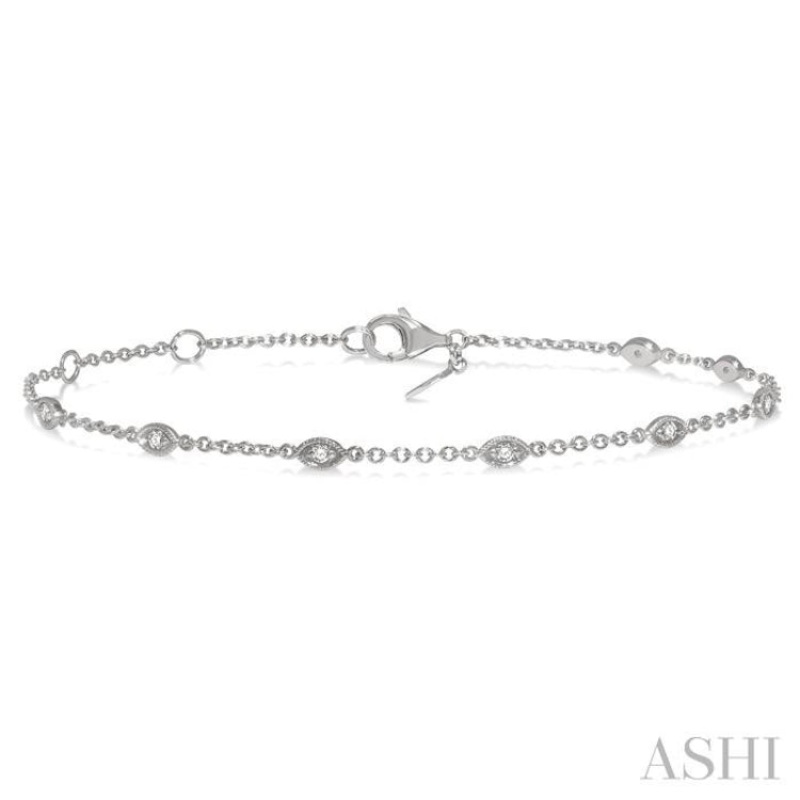 A graceful diamond station bracelet, this is a piece of jewelry that you would never want to take off. Feasible for anytime wear, this bracelet is a cool addition to your jewelry box. Its beauty lies in its simplicity and the diamonds that decorate it. The bracelet features 8 marquise shape mounts, connecting one another via thin cable chain links, with each mount distanced equally in-between. There is a total of 8 pave set round cut diamonds, one each embellishing the 8 mounts. A 10 karat white gold lobster clasp completes the look. The diamond station bracelet is styled in 10 karat white gold. The total diamond weight is 1/6 Ctw.