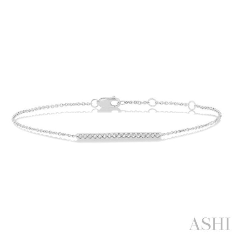 A simple yet attractive and stylish bracelet, this makes a great piece to add to your everyday essentials. Besides, it comes from the Petite collection, which is highly in demand this season. The bracelet features a bar shape centerpiece that is decorated with round cut diamonds. There is a total of 17 pave set round cut diamonds embellishing the bar. A link chain completes the bracelet, while a lobster clasp secures it in place. The Petite diamond bracelet is crafted in a rhodium finish 10 karat white gold. The total diamond weight is 1/6 Ctw.