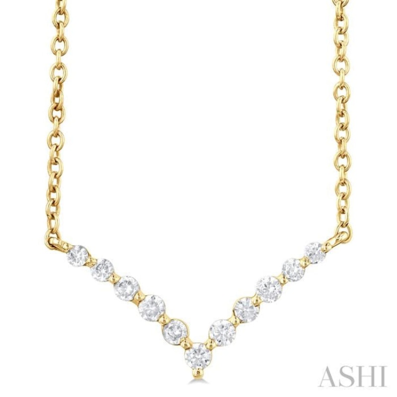 A pretty diamond necklace, which offers beauty even in its simple layout. It makes a good addition to one's jewelry box. The necklace features a Chevron necklace, with round mounts linked via ball links. There are 5 each round mounts flanking the center mo