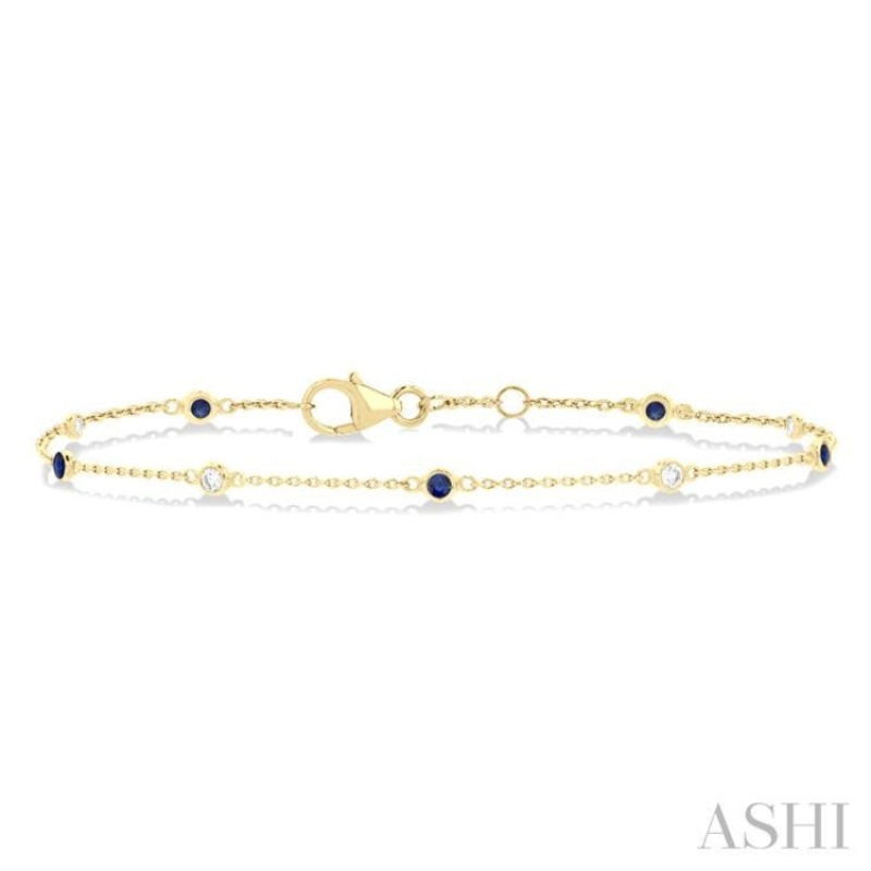 A sleek and slender, precious gemstone station bracelet, this offers instant appeal. It features round cut sapphire and diamonds, alternating each other, placed at certain intervals along the link chain, as is common in a station bracelet. There is a total of 5 round cut 1.8 MM sapphires and 4 bezel set round cut diamonds embellishing the bracelet. A lobster clasp closure secures the bracelet. The precious gemstone station bracelet is fashioned in a polished finish 14 karat yellow gold. Total diamond weight is 1/10 Ctw.