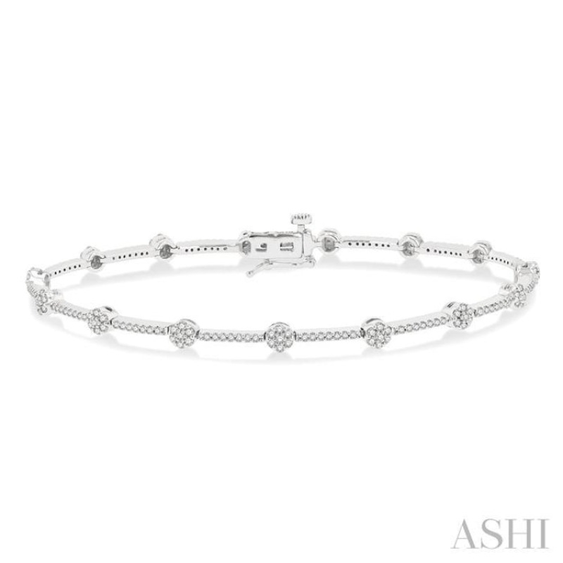 A distinctive diamond bracelet, this features bar links instead of link chains. Each bar link displays a tiny round mount on one end, while the other end fits into the round mount of the following bar link. An open box clasp with push-release knob and exterior double snap-lock, completes the bracelet. Each bar link is embellished with 13 prong set round cut diamonds, with 12 prong set round cut diamonds on the clasp and bar leading to it, total of 129 diamonds. The round mounts are adorned with 7 each prong set round cut diamonds, total 70, one in the center and 6 encircling it. The bracelet is styled in 10 karat white gold. The total diamond weight is 1 Ctw.