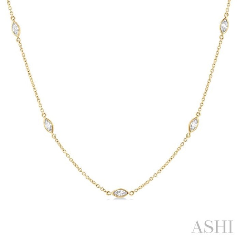 A delicate gold station necklace with diamond studs offering it an elegant touch. This pretty necklace can be worn by itself or with other accompaniments that you may choose to wear. It features 11 bezel set marquise cut diamonds that are placed at certain intervals around the link chain to give it an even better and wholesome look. The cat link chain that makes the base of the necklace has a standard length of 18 inches. The charming diamond necklace is designed in 14 karat yellow gold. Total diamond weight is 1 Ctw.