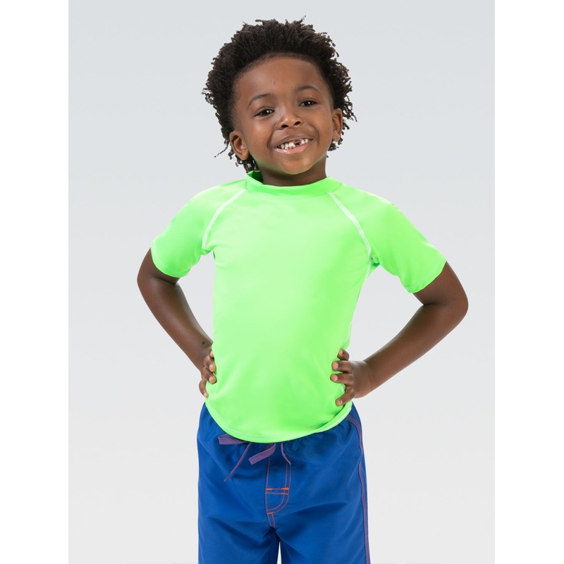STYLE: Little Dolfin Rash guard. GREAT DETAILS: Protect your little one from the sun in style in our bright lime rash guard featuring short sleeves, a mockneck for extra coverage, and a 50+ UV protection to help protect your child. PERFECT FIT & FEEL: This