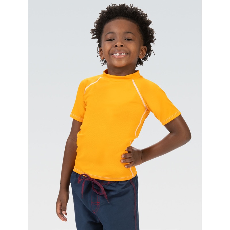 STYLE: Little Dolfin Rash Guard GREAT DETAILS: Keep having fun in the sun in style in our orange rash guard featuring short sleeves, a mockneck for extra coverage, and a 50+ UV protection to help protect your child. PERFECT FIT & FEEL: This medium-weight p