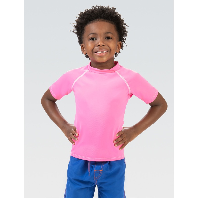 STYLE: Little Dolfin Rash Guard GREAT DETAILS: Pretty in pink! Protect your little one from the sun in style in our rash guard featuring short sleeves, a mockneck for extra coverage, and a 50+ UV protection to help protect your child. PERFECT FIT & FEEL: T