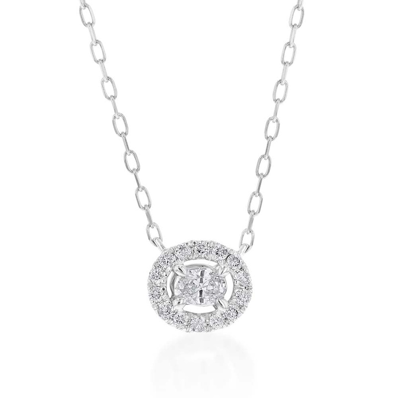 Enchanting 10ct white gold pendant with15 diamonds features 1 oval diamond with halo & 10ct white gold adjustable 41-46cm chain