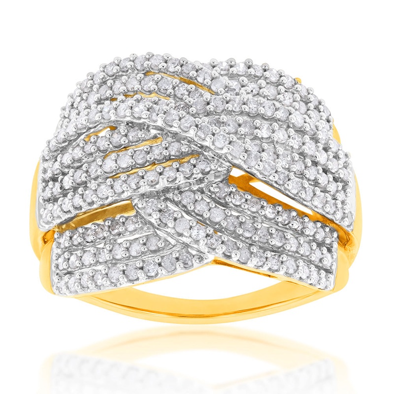 Enhance your outfit with this stunning 10ct Yellow Gold 1 Carat Diamond Cross Over Ring. This ring turns special moments into forever memories, boasting a stunning cross-over design of 1 carat diamonds. The ring band exudes a welcoming gold hue, inviting attention to the ring. An everyday accessory for a hint of brilliance, this ring is the epitome of beauty.
