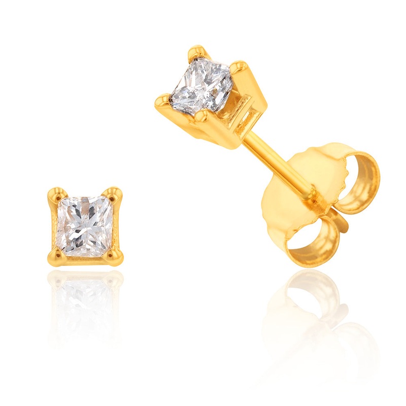 Earrings fit for a princess, these 14ct 1/5 Carat Princess Diamond Stud Earrings feature a beautiful princess cut diamond that is being held in place by luxurious gold. With its four post grip it almost looks as if a hand is gripping the diamond. Treat you
