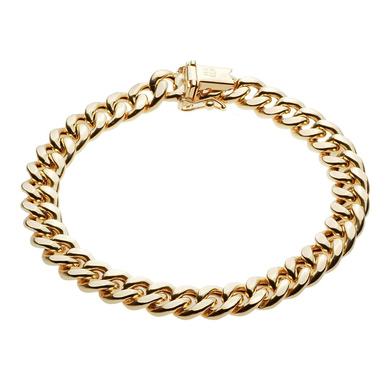 This stunning 14K gold bracelet features a classic Miami Cuban link design. It's made of solid gold links, not hollow, so it's built to last. The bracelet is available in a variety of widths and lengths to suit any style.Features:Solid 14K goldMiami Cuban