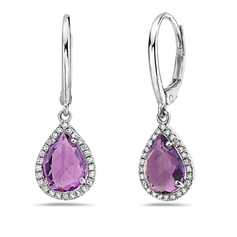 14K white gold earrings with pear cut amethysts (2.23ct) in a halo of diamonds 0.12cttw