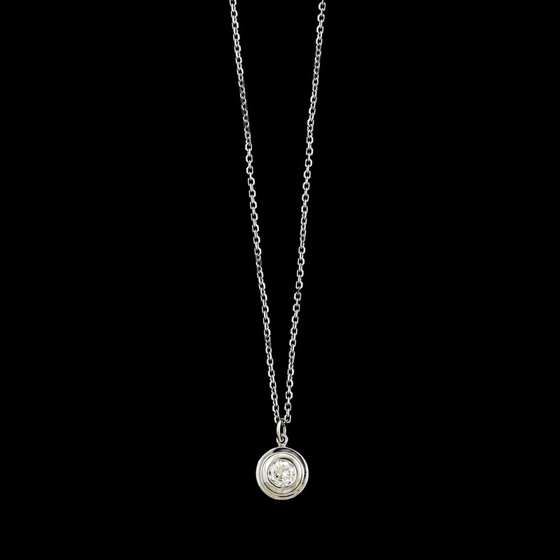 14K White Gold Diamond Solitaire Pendant NecklaceThe pendant is bezel set with oneround brilliant cut diamondDiamond weighing approx. .20cts., J/SILength 18"