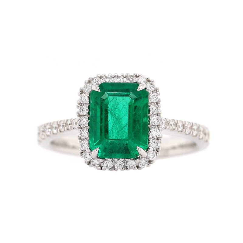 14k white gold ring featuring a emerald cut emerald stone with a diamond halo.