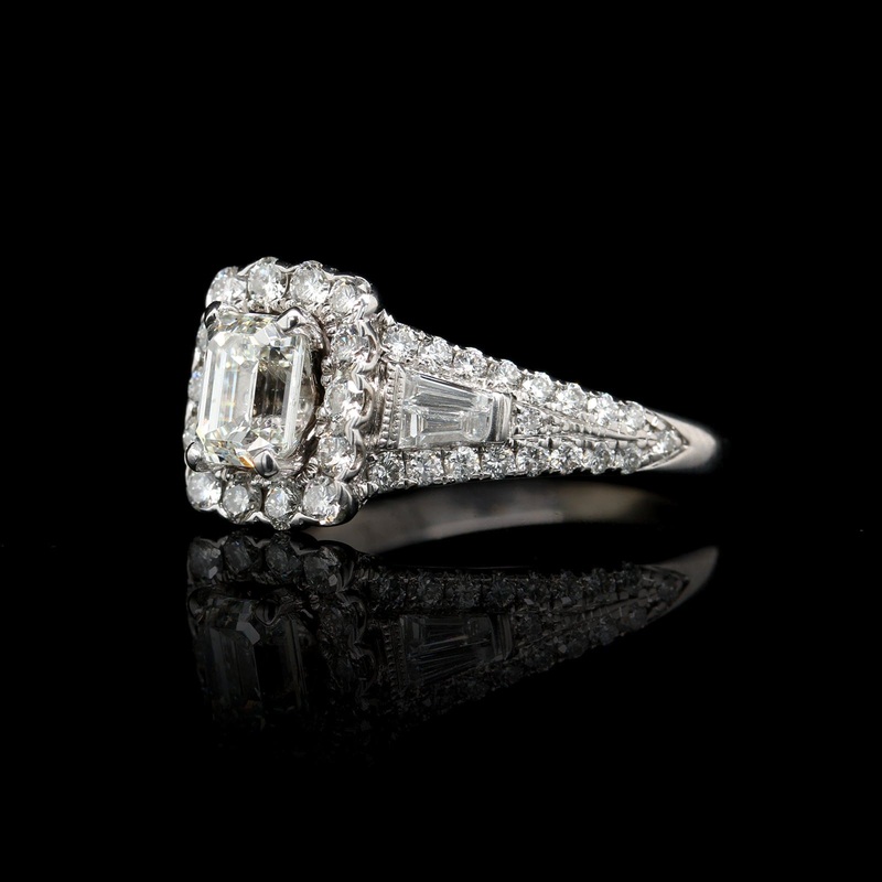 14K White Gold Estate Diamond Halo Engagement RingThe ring is set with one emerald cut diamondDiamond weighing approx. 1.00cts., J/SI2And 60 full cut and baguette cut diamonds, approx. 1.00cttw., H/VSSize 6 1/4