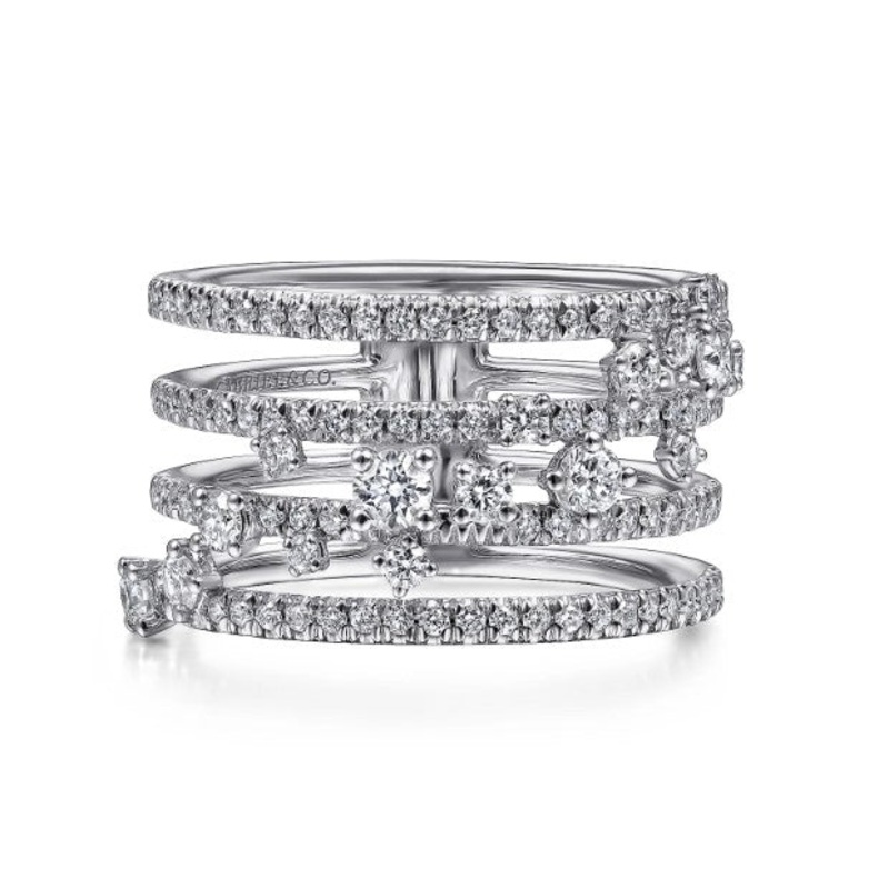 14K white gold five-row fashion ring with clusters of diamond accents 0.93cttw