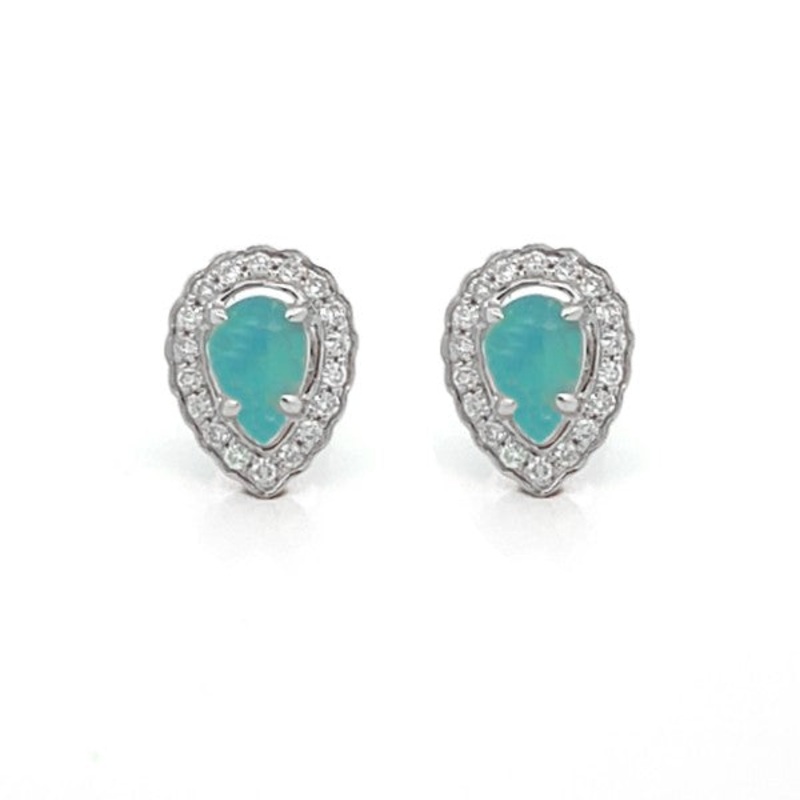 14K white gold earrings with 0.56cttw of pear cut opals in halos of diamonds 0.20cttw