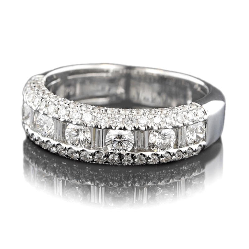 14k white gold band with center row alternating round and baguette diamonds set north to south and pave edges with 2 rows of round diamonds halfway around.
