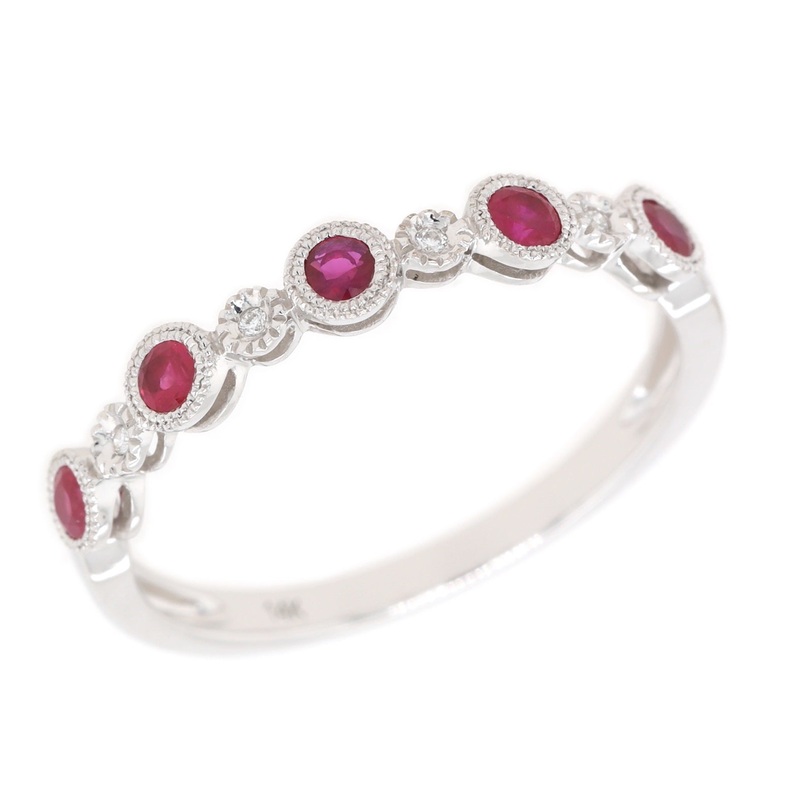 Ruby and diamond stacking band ring set in 14K white gold features round bezel set gemstones mill grain details.Ruby: 0.27 carats total weightDiamonds: 0.01 carats total weight. VS clarity.This ring can be worn alone or stacked with other rings.Ring is a s