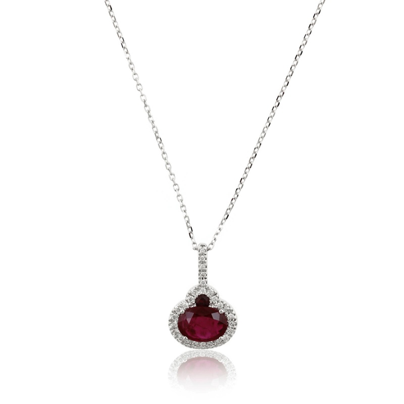 14k white gold ruby and diamond halo pendant containing 1 oval and 1 round ruby approx. 1.15cts tw surrounded by a diamond halo, 27 round diamonds approx. .11cts tw.