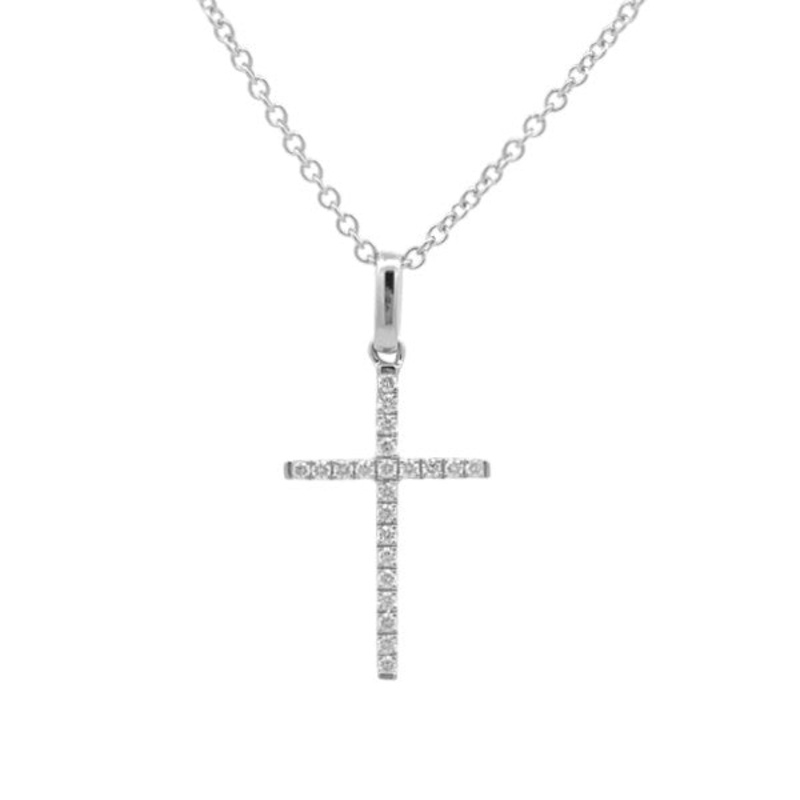14K white gold cross pendant with 0.10cttw of diamonds. 17x11mm. Chain sold separately.