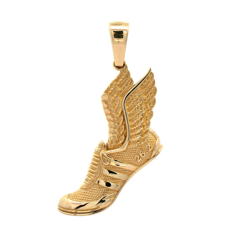 14k yellow gold running tennis shoe charm with wings and 26.2 on the heel of the shoe.