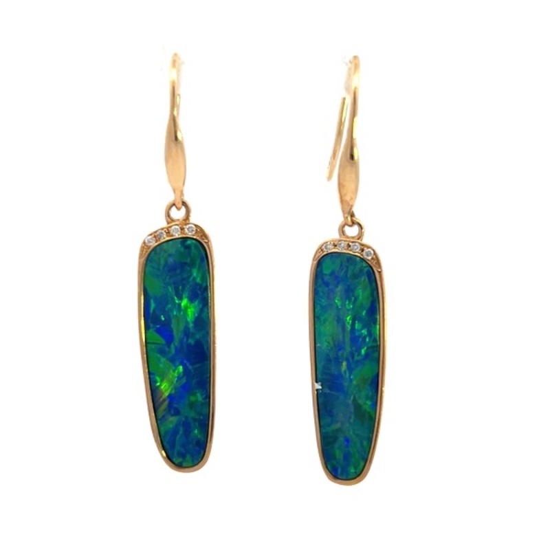 14K yellow gold earrings with bezel set Australian Andamooka opal doublets with ddiamonds