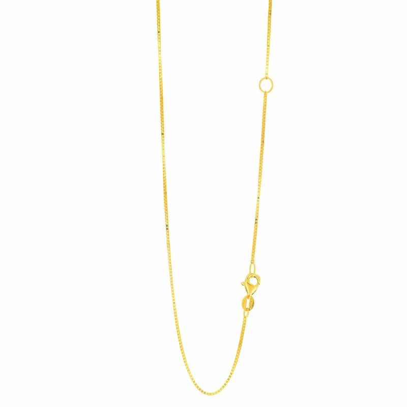 14kt 18" yellow gold 0.8mm classic box chain with lobster clasp with extender at 16".PLEASE NOTE: This can be special ordered in different metal types and sizes (prices may vary).