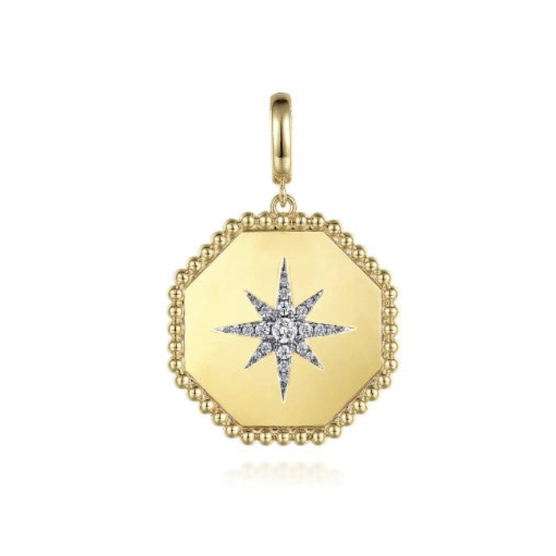 14K yellow gold diamond starburst hexagon medallion pendant with pave diamonds. 0.20cttw. Chain sold separately.