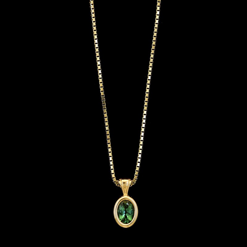 14K Yellow Gold Estate Green Tourmaline Pendant NecklaceThe pendant is set with one oval cutgreen tourmalineTourmaline weighing approx. 1.25cts.Length 18"