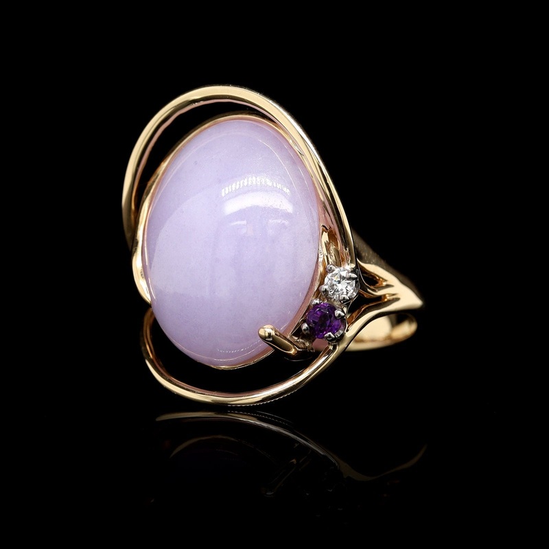 14K Yellow Gold Estate Lavender Jadeite Amethyst and Diamond RingThe ring is set with one oval cut double cabochon lavender jadeiteJadeite measuring approx. 17.78 x 13.85 x 7.53mm.GIA report type A,Size 6