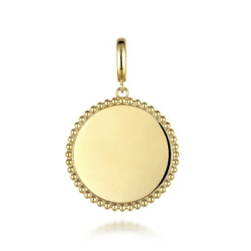 Crafted to be customized, this 24mm round Bujukan pendant can be engraved with the name, date or other message of your choice. The simple shape is designed in 14K yellow gold and accented with a beaded frame. Add the chain of your choice for a versatile ev