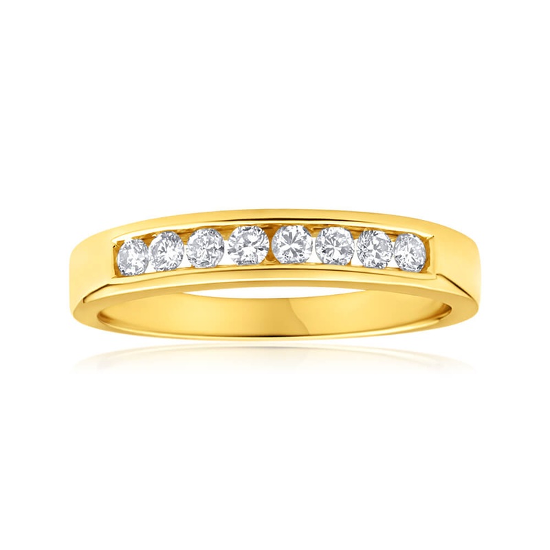 Sparkle through each day with the 18ct Yellow Gold Ring With 8 Diamonds Totalling 0.2 Carats. A simple design that features the warm hues of 8ct yellow gold along with the dazzling glitter of 8 diamonds, this ring is perfect for ring stacking. Whether it be a wedding band, eternity ring, or simply an addition to the jewellery collection, this ring is a staple.