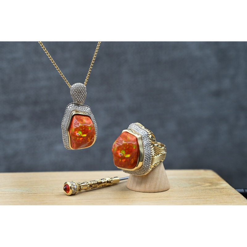 A beautiful example of top quality Natural Mexican Fire Opal, this cherry red gem has a fantastic play of color. Formed in the harshest environments that were the ancient volcanoes of Mexico, this Opal at 22.90 carats is surely a once in a lifetime gem. Custom set in a piece that is versatile for every wearer as a ring or a necklace. Crafted in 18k yellow gold and having a total carat weight of 3.05 carats in natural Diamonds. Matching Screwdriver Included!