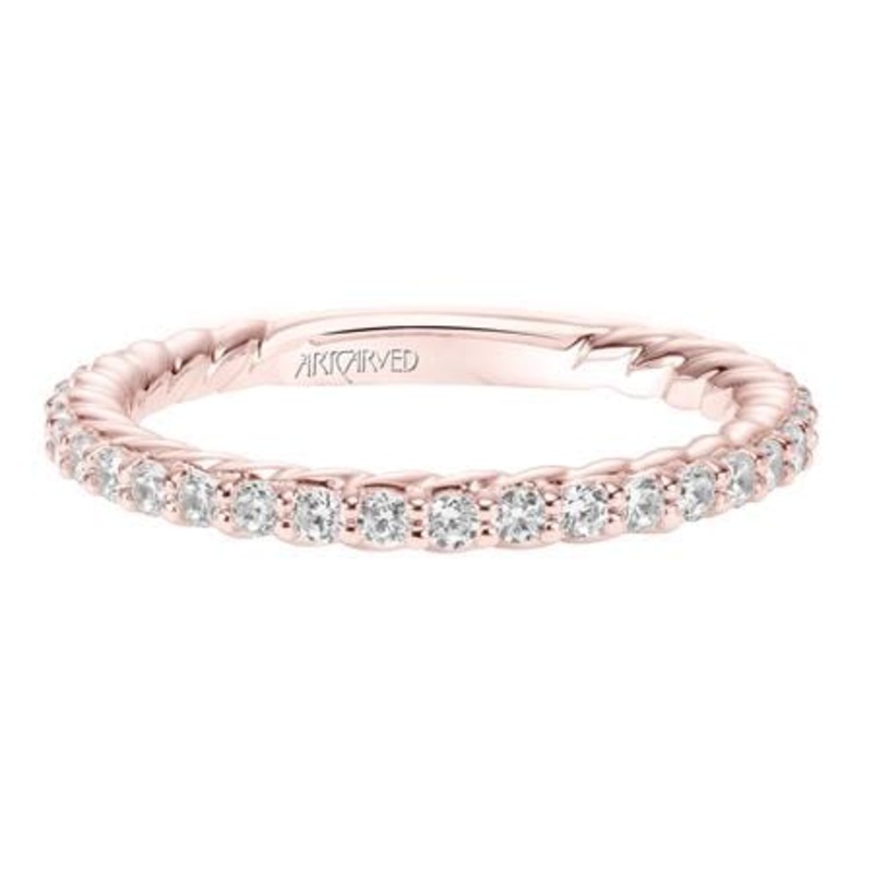 18k rose gold shared prong band with round diamonds 3/4 around and cable interior.