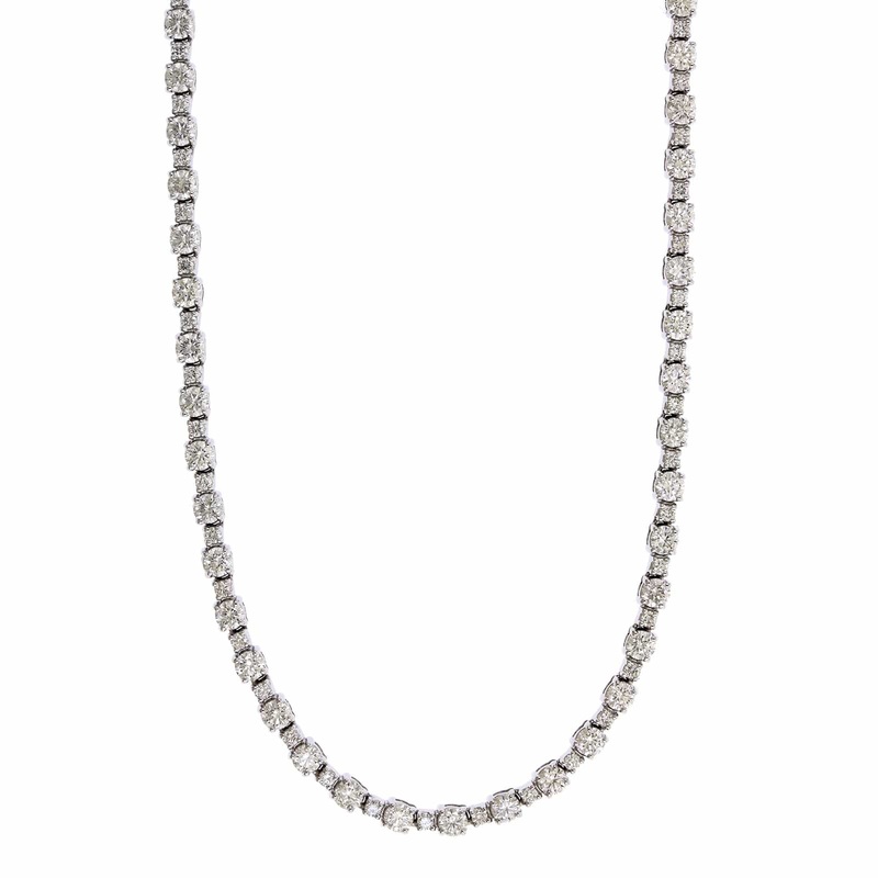 18k white gold 4 prong necklace that features round diamonds alternating in size.