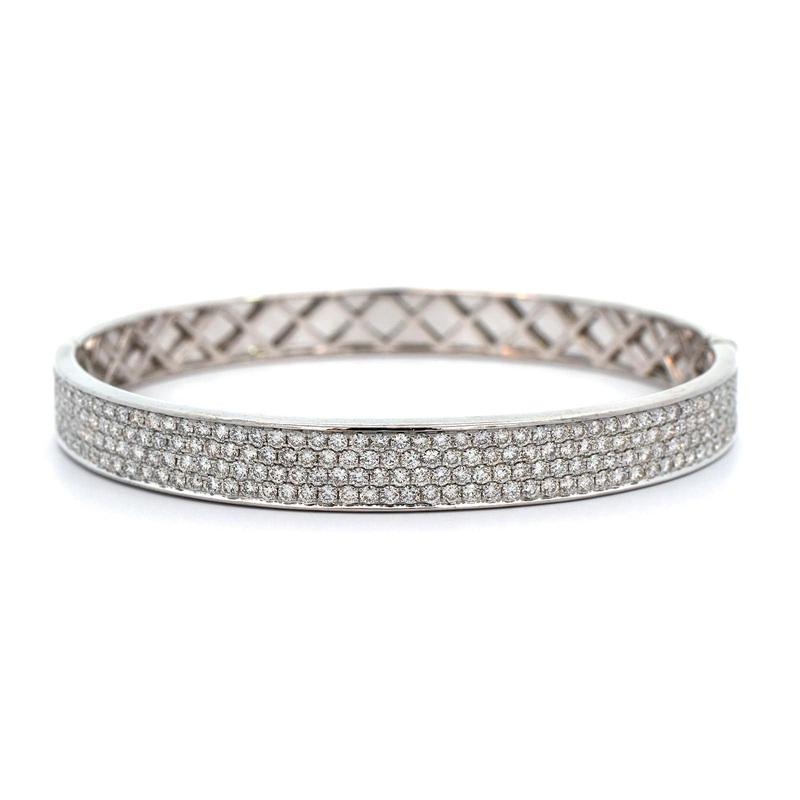 18k white gold bangle bracelet with 4 rows of round pave diamonds.